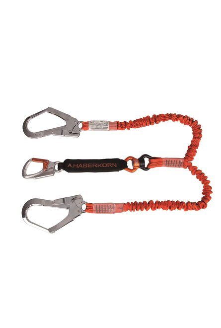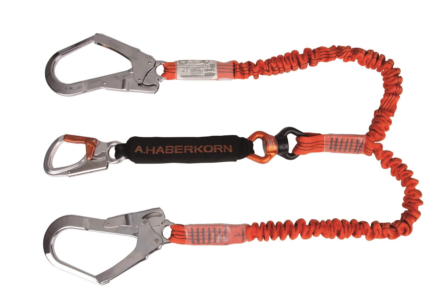 - Unteres Ende: AHK-Einhandkarabiner, Drehwirbel SWIVEL, Bandfalldämpfer ARRESTER mit abnehmbarer textiler Hülle